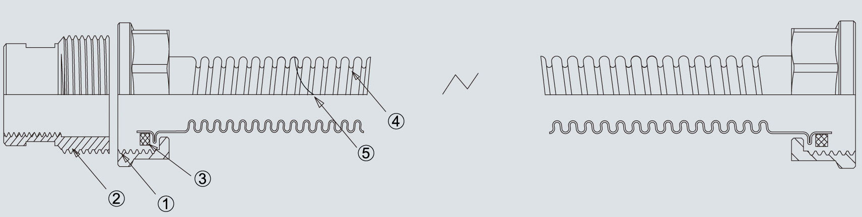 ③垫圈④SS304不锈钢螺旋波纹管⑤PE包覆